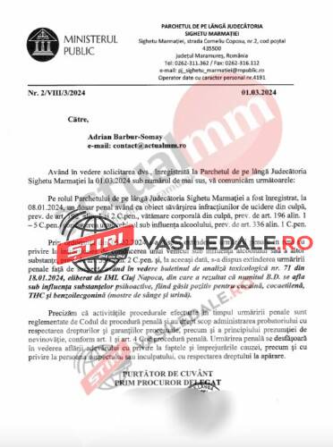 ”Având în vedere solicitarea dvs înregistrată la Parchetul de pe lângă Judecătoria Sighetu Marmației la 01.03.2024 sub numărul de mai sus, vă comunicăm următoarele: