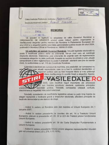 PMP Filiala Maramures a depus astăzi la Instituţia Prefectului Judeţului Maramures un memoriu prin care solicită sesizarea Guvernului României cu privire la adoptarea Ordonanţei de Urgenţă privind unele măsuri pentru organizarea și desfășurarea alegerilor pentru membrii din România în Parlamentul European din anul 2024 și a alegerilor pentru autoritățile administrației publice locale din anul 2024. OUG 21/2024 modifică elemente esențiale în ceea ce privește desfășurarea alegerilor și mandatele aleșilor locali, cu doar trei luni înainte de data propriu-zisă a scrutinului, ceea ce contravine flagrant standardelor constituționale, dar și internaţionale.