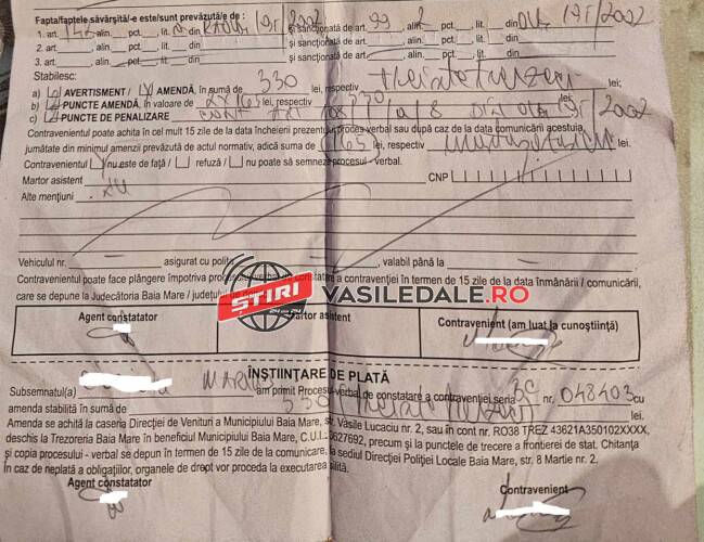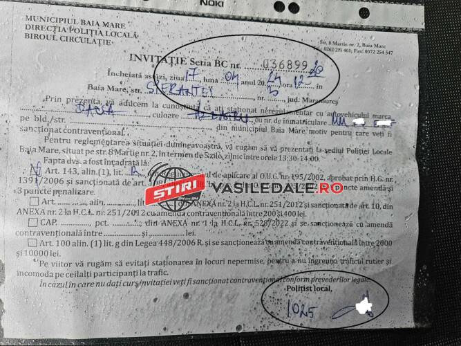 Dar să revenim. Un șofer din Satu Nou de Sus, și-a parcat mașina într-un loc neregulamentar (NU încurajăm astfel de practici, n.r.). Echipajul Poliției Locale Baia Mare i-a lăsat ”celebra invitație” de a se prezenta la sediu pentru clarificarea situației.