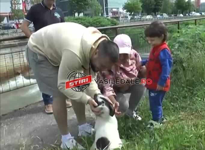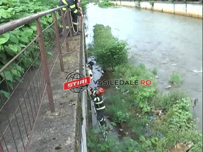Intervenție de urgență pe râul Săsar din Baia Mare. Pompierii militari au intervenit pentru salvarea unui cățeluș care nu putea ieși din albia îndiguită a râului.