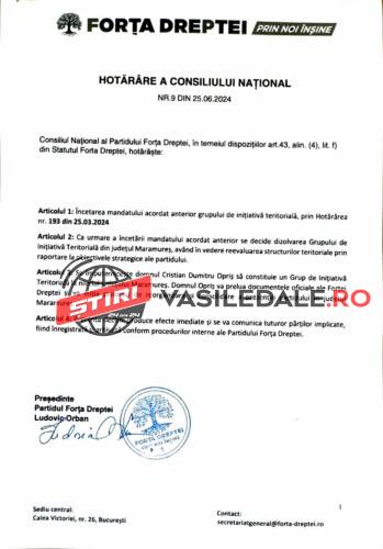 ”Se împuternicește domnul Cristian Dumitru Opriș să constituie un Grup de Inițiativă Teritorială la nivelul județului Maramureș. Domnul Opriș va prelua documentele oficiale ale Forței Dreptei și va iniția procesul de reorganizare și consolidare a prezenței partidului în județul Maramureș” se precizează la articolul 3.