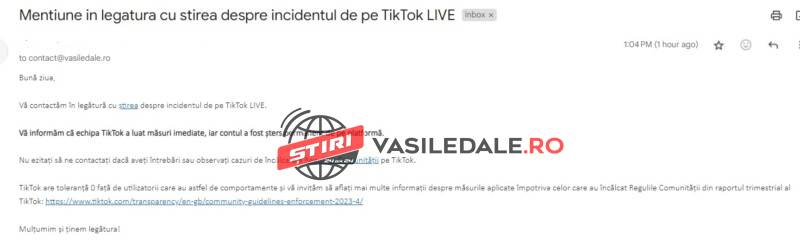 Vă informăm că echipa TikTok a luat măsuri imediate, iar contul a fost șters permanent de pe platformă.