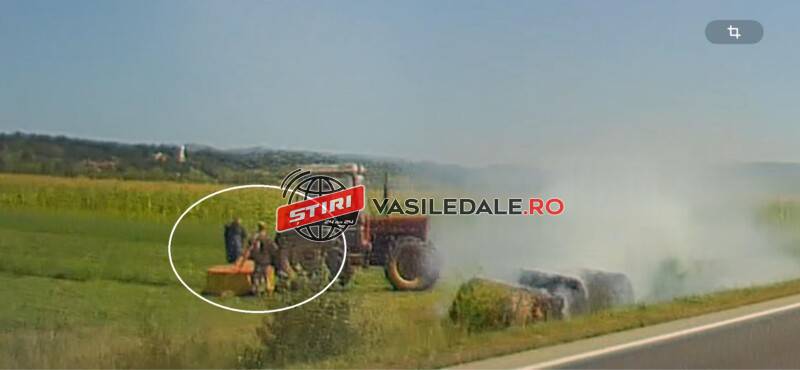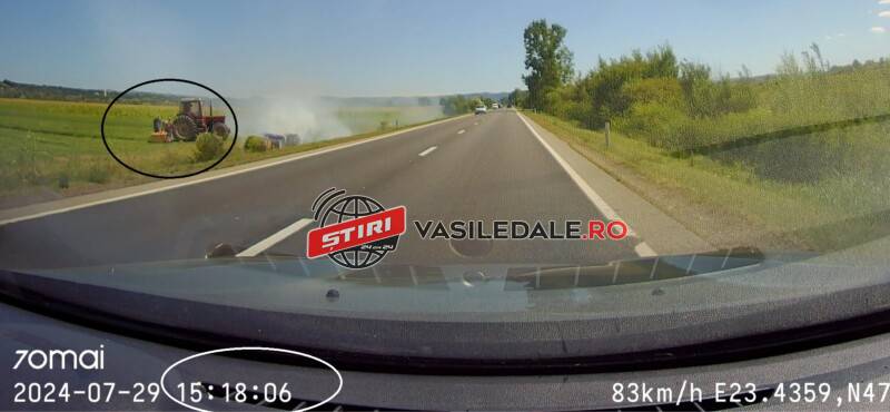 Numai că un alt participant la trafic ne-a transmis imagini de pe camera de bord amplasată pe mașină care arată clar faptul că la ora 15.18 baloții de iarbă ardeau supravegheați de două persoane. Era și un tractor la fața locului, utilaj la care era atașată o cositoare pentru iarbă.
