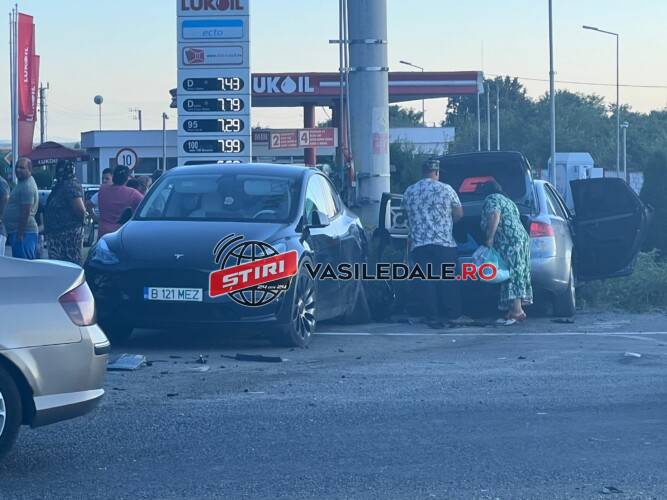În urma impactului un Opel a ajuns în şanţ, un Audi şi un autoturism Tesla în gardul de la benzinărie.