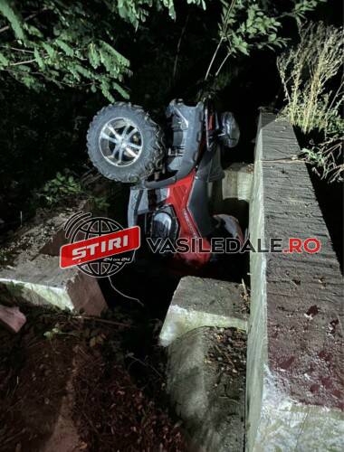 La un moment dat a pierdut controlul ATV-ului și a lovit violent un podeț din beton. Tânărul care nu purta cască de protecție a fost aruncat în bordura podețului iar ATV s-a infipt într-un gură de la canalizare.
