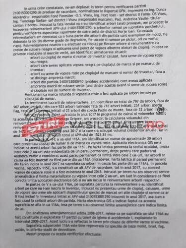 ”În urma patrulării efectuate pe raza districtului 2 Făina în data de 10-11 septembrie în zona Suligu-Botizu, am constatat în parcela 116A din UP II cant Botizu probleme legate de partida (…). Menționez, în APV constituit figurează un număr de 907 arbori cu un volum de 1.521 mc, în timp ce în teren în urma evaluării făcute de mine, se găsesc un număr de aproximativ 380-400 de arbori cu un volum aproximativ de 500 mc.