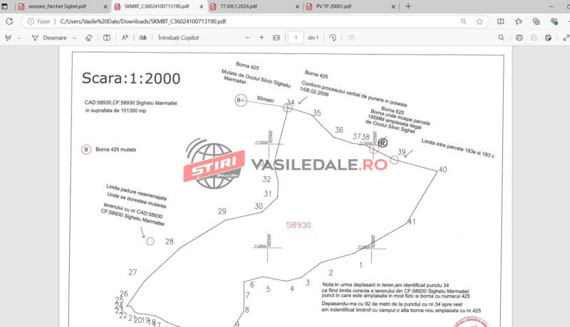 Drept urmare concluziile identificarii in teren a limitelor proprietatii noastre, a bornei 425 (de la data punerii in posesie conf. P.v. 1/08.02.2006), precum si identificarea bornei 425 amplasata ilegal la 92 de metri de locul initial au fost mentionate pe schita intocmita si semnata de expertul topograf.(anexat prezentei plangeri penale).