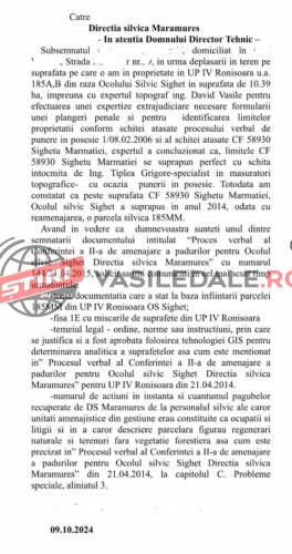 Din Raportul de control nr. 11319/22.10.2015 rezultă că pe suprafața în cauză au fost constituite 2 acte de punere în valoare a masei lemnoase în ua 185R, deși amplasamentul nostru este situat în ua 185A, 185B (fostul UP IV Ronișoara) care au fost autorizate spre exploatare. La data prezentei, în teren nu se mai află masă lemnoasă, deși suprafața în cauză se află sub contract de servicii silvice cu Ocolul Silvic Sighet. În interesul limitării cuantumului prejudiciului insemnat produs subsemnatilor și statului roman reținut în solidar în sarcina RNP – Romsilva, MMAP, GF Judeteana Maramures și GF Cluj, precum și a îndeplinirii obligațiilor ce revin proprietarilor de păduri referitoare la reîmpădurirea terenurilor forestiere și întocmirea amenajamentelor silvice, am solicitat în scris Ocolului Silvic Sighet,