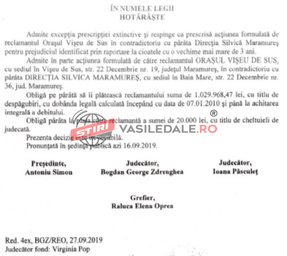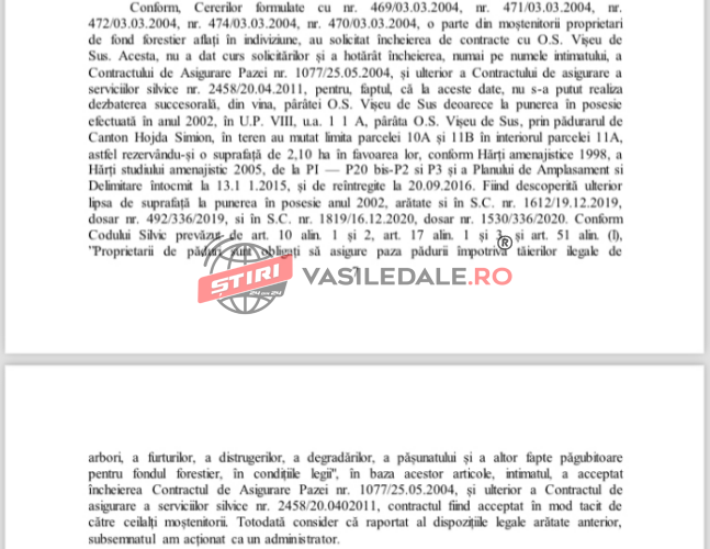 De asemenea, Judecătoria Vișeu de Sus, prin sentința civilă nr. 1819/2020, a dispus anularea adresei nr. 5941/15.08.2017 a Ocolului Silvic Vişeu privind rezilierea parţială a contractului de pază nr. 2458/20.04.2011 pentru suprafaţa de 17,6 hectare teren forestier.
