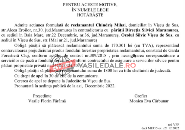 Conform sentintei civile nr. 2139/2022 ramasa definitive, instanta hotaraste: “Obliga paratii(DS Maramures si OS Viseu) sa plateasca reclamantului suma de 170.301 lei(cu TVA), reprezentand contravaloarea prejudiciului produs fondului forestier proprietatea reclamantului, constatat de Garda Forestiera Cluj, conform actului de control nr.309/2018, prin neasigurarea corespunzatoare a serviciilor de paza a fondului forestier, conform contractului de asigurare a serviciilor silvice pentru paduri nr. 2458/20.04.2011”.
