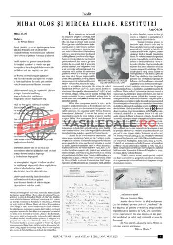Ana Olos oferă, la pagina de „Restituiri”, un inedit episod al întâlnirii lui Mihai Olos cu Mircea Eliade, precum și o imagine cu scrisoarea acestuia către artistul maramureșean.