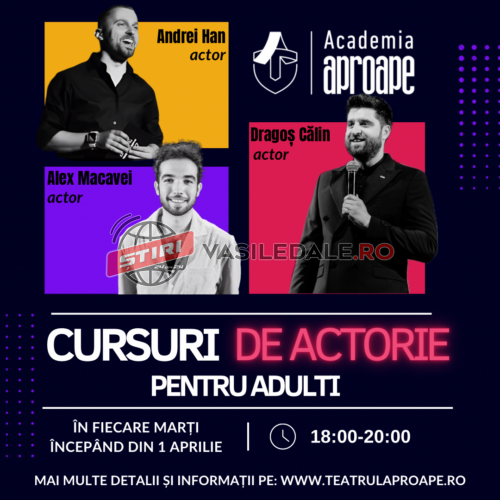 Academia Aproape Baia Mare pregătește un al treilea curs de actorie pentru adulți! Dezvoltă-ți spontaneitatea, încrederea și abordează o nouă viziune asupra lucrurilor obișnuite, prin cursurile de actorie. Nu e târziu să lași arta interpretării să te surprindă. Noul curs de actorie va fi coordonat de trei actori remarcabili: Dragoș Călin, Alex Macavei și Andrei Han, fiind destinat adulților care vor să iasă din rutina zilnică monotonă și să lase grijile în afara sălii de repetiție, dar și să își dezvolte abilitățile de vorbit în public.