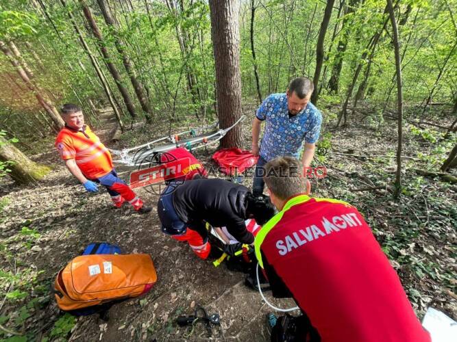 Actiune de salvare derulata de salvatorii montani ai SPJ Salvamont Maramures, structura profesionista de salvare montana a Consiliului Judetean Maramures, in zona Parcului Regina Maria, pe traseul de mountain bike pentru acordarea primului ajutor si evacuarea unui baiat de 14 ani care in urma cazaturii a suferit un traumatism abdominal si lovituri la membrele inferioare.