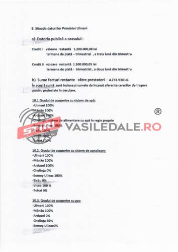 Primăria Ulmeni are o datorie publică totală de 2,7 milioane lei (două credite distincte) și facturi restante de peste 4,2 milioane lei. În total, aproape 7 milioane de lei în condițiile în care multe sate nu au canalizare, drumuri asfaltate sau rețele de gaz.