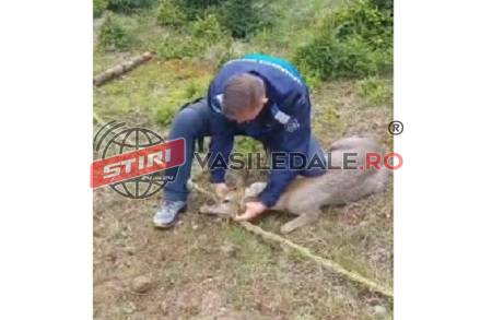 Speriată, se zbătea să scape iar unul dintre jandarmi s-a apropiat încet de ea pentru a nu o agita și mai mult, a reușit să îi scoată plasa și să o elibereze. Animalul speriat dar și fericit că a fost salvat a alergat înapoi spre pădure.