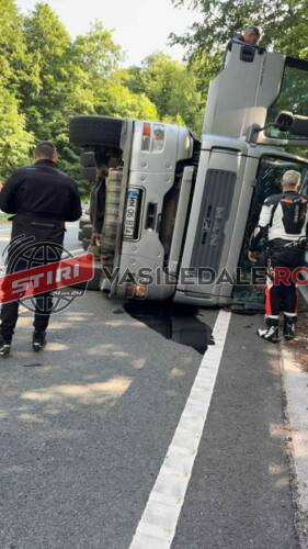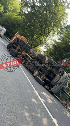 Traficul rutier în zonă este blocat deoarece se intervine cu o macara pentru a transfera marfa transportată pe un alt camion. Totodată se va încerca repunerea mastodontului pe roți.