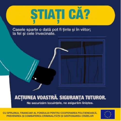 Deși situația statistică e în scădere, în continuare, depunem eforturi pentru reducerea numărului de infracțiuni contra patrimoniului și vă recomandăm să luați măsuri pentru siguranța locuinței dumneavoastră: