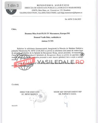 ”La ora 13 reprezentanții ANSVSA au fost la spital. Au verificat blocul alimentar. Nu au depistat niciun fel de insecte/gândaci. Deficiențe de structură există având în vedere vechimea clădirii spitalului care este de peste 40 de ani. Vă rog să informați opinia publică că nu există invazie de insecte / gândaci în spital. NIci în secții, nici în blocul alimentar” a transmis dr Florin Lupașcu, manager Spitalul de Recuperare Borșa.