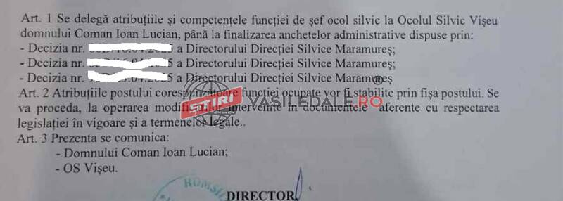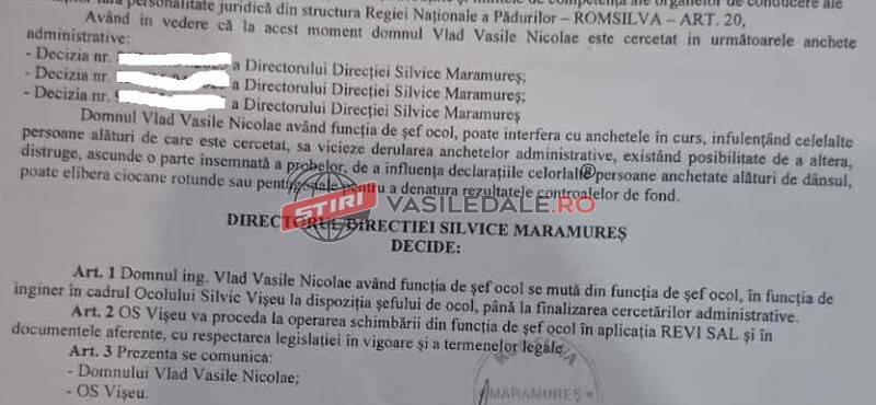 Site-ul nostru a scris în ultimii ani de zile despre ce s-a întâmplat la Ocolul Silvic Vișeu. V-am prezentat în 4 octombrie 2024 cu documente cum s-au ”evaporat prin casare” 1.000 mc de lemn. (https://vasiledale.ro/2024/10/04/exclusiv-documente-1-000-mc-de-masa-lemnoasa-de-la-os-viseu-s-au-evaporat-pardon-s-au-casat-prin-putrezire-garda-forestiera-in-control-dar-recompensati-cu-cazare-speciala-echipament-watherproof-sau-me/). Acesta articol a adus la finalul lunii martie 2025 la angajații OS Vișeu și DS Maramureș pentru infracțiunea de ”divulgare de documente nepublice…”. Infracțiune pe care tot noi v-am dovedit că nu există.