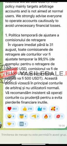 Mai mult ”distracția” continuă. Glumim evident. Auziți aici: ”politică temporară de ajustare a comisionului de retragere – în vigoare imediat până la 31 august. Toate comisioanele de retrage ale conturilor fi fi ajustate temporar la 99,5% (de exemplu: pentru o retragere de 100.000 USD, comisionul va fi de 99.500 USDT, iar suma efectiv primită va fi 500 USDT)”. Cu alte cuvinte, adio bani dacă încercați să vi-i retrageți. Nu de alta dar comisionul ”temporar” (mamă ce bine râdem este 99,5%) îi dă banuții voștri ”agentului Kevin” iar vouă vă rămâne o firimitură cel mai probabil căzută de la colțul guriii agentuțului Kevinuț care se foia încoace și încolo, cu căștile pe urechi, prin ceva încăpere insalubră ascunsă prin ceva țărișoară de prin Oceanul Indian.