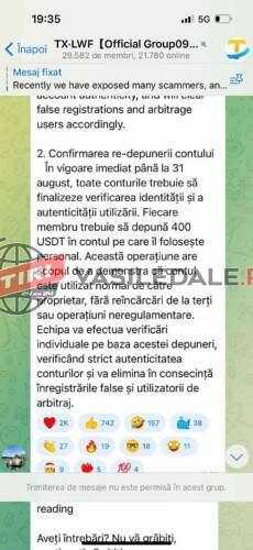”Confirmarea re-depunerii contului. În vigoare imediat până la 31 august, toate conturile trebuie să finalizeze verificarea identității și a autenticității utilizării. Fiecare membru trebuie să depună 400 USDT în contul pe care îl folosește personal. Această operațiune are scopul de a demonstra că contul este utilizat noral de către proprietar, fără reîncercări de la terți sau operațiuni neregulamentare. Echipa va efectua vericirări individuale pe baza acestei depuneri, verificând strict autenticitatea conturilor și va elimina în consecință înregistrările false și utilizatorii de arbitraj”. Un mesaj scris 100% de Chat-CBT. Un mesaj pe care suntem convinși că mulți îl vor crede autentic și vor depune 400 de dolari. Este incredibil că nimeni din țara asta nu blochează odată astfel de pagini și aplicații, așa cum o fac toate țările normale la cap și își protejează cetățenii de așa zisi ”agenți Kevin”.