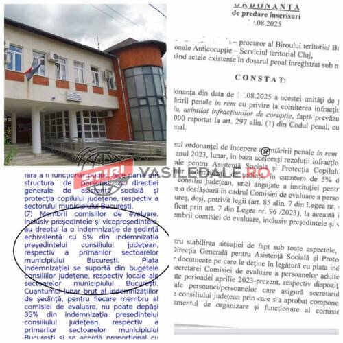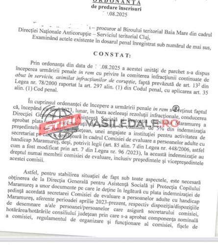 În ordonanța de ridicare a documentelor care a ajuns în posesia www.vasiledale.ro se arată clar faptul că urmărirea penală este IN REM și că ”s-a reținut faptul că, începând cu anul 2023, lunar, în baza aceleeași rezoluții infracționale, conducerea DGASPC Maramureș a a probat plata unor indemnizații de ședință, în cuantum de 5% din indemnizația președintelui de consiliu județean, unei angajate a instituției pentru activitatea de secretariat pe care o desfășoară în cadrul Comisiei de evaluare a persoanelor adulte cu handicap Maramureș, deși, potrivit legii (art. 85 alin 7. din legea nr. 448/2006, astfel cum a fost modificat prin art. 7 din Legea nr. 96/2023), la această indemnizație au dreptul numai membrii comisiei de evaluare, inclusiv președintele și vicepreședintele acestei comisii”.