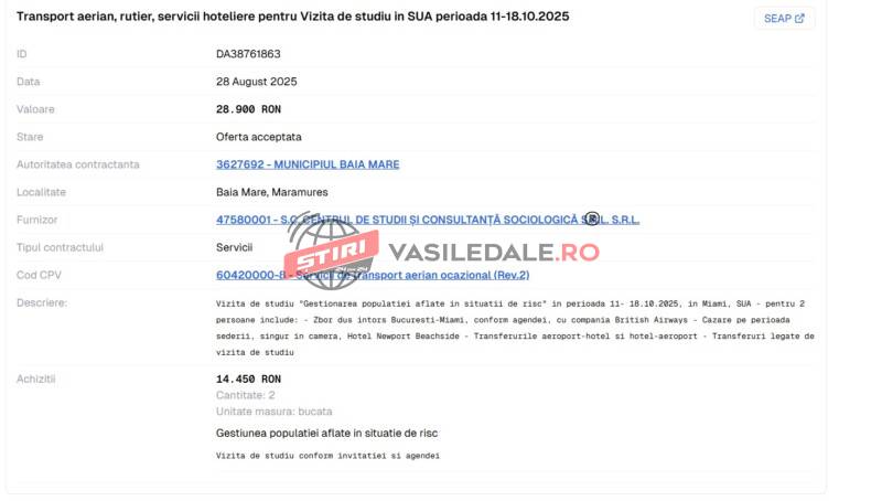 Înainte de Miami, pe 8 septembrie, primarul împreună cu 5 subordonați pleacă în Franța, la Paris. E drept sejurul este mai scurt: 3 zile. 5.200 de euro pentru semnarea unui contract de finanțare cu Banca de Dezvoltare a Consiliului Europei. ”Acum ce să zic. Trebuie să facă și viceprimarii ceva. Primarul trebuie să stea la muncă” a conchis edilul băimărean.