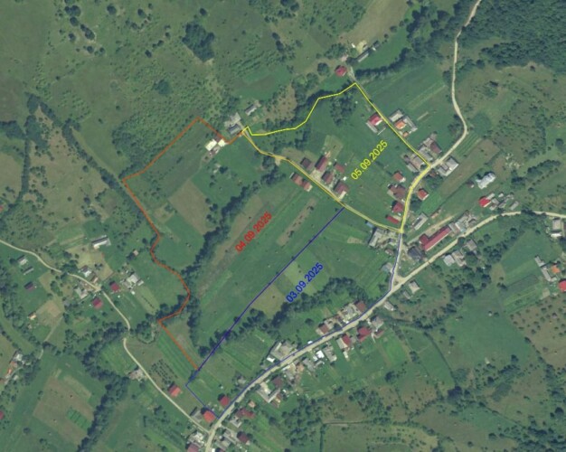 În perioada 03.09.2025- 05.09.2025 se vor efectua măsurători pentru terenurile din locurile denumite popular: ” Valea Muntelui” (Zona evidențiată cu galben) și” Valea Popii”. (Zona evidențiată cu roșu și albastru).