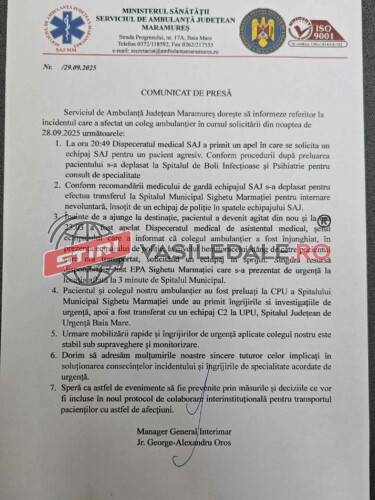 ”Încep cu vestea bună și anume că ambulanțierul nostru este în afara oricărui pericol. A fost un incident legat de transportul unui pacient bolnav psihic, pacient psihic nepercheziționat de către poliție înainte de imobilizarea la noi în ambulanță. Se pare că acesta a fost contenționat în ambulanță, însă cumva și-a desfăcut legăturile. Înțeleg că și-a aprins o țigară, moment în care ambulanțierul a tras pe dreapta și a mers să vadă ce se întâmplă în spate. Pacientul avea asupra lui un cuțit de vântătoare el nefiind percheziționat de poliție și a încercat să îl înjunghie pe ambulanțier. Acesta a avut o reacție foarte bună instinctivă de a se feri și practic și-a salvat viața. Din punctul meu de vedere multe prevederi legale care vizează siguranța transportului unor pacienți bolnavi psihic nu sunt reglementate corect și eu mă gândesc că poate sunt parlamentari maramureșeni care să ia și problema asta în serios și să o trateze ca atare” ne-a declarat Alexandru Oros, manager Serviciul Județean de Ambulanță Maramureș.