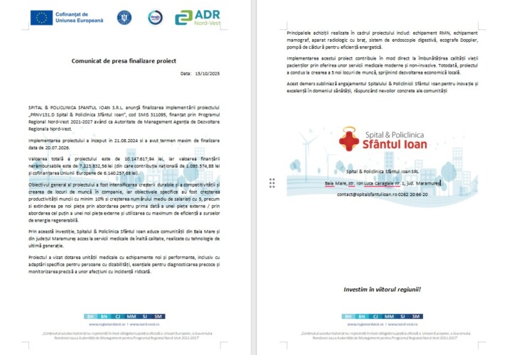 SPITAL & POLICLINICA SFANTUL IOAN S.R.L. anunţă finalizarea implementării proiectului „PRNV131.D Spital & Policlinica Sfântul Ioan”, cod SMIS 311095, finanțat prin Programul Regional Nord-Vest 2021-2027 având ca Autoritate de Management Agenția de Dezvoltare Regionala Nord-Vest.
