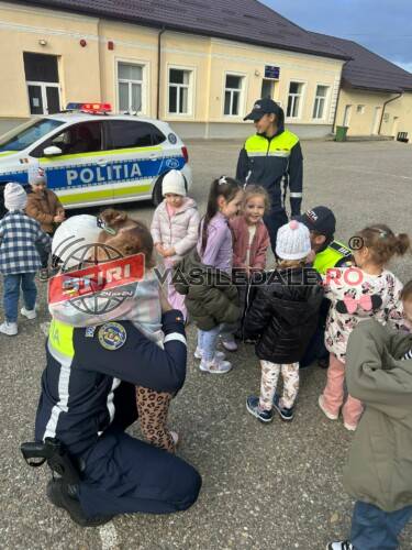 Totodată, polițiștii le-au prezentat elevilor dotările și echipamentele specifice folosite în activitatea zilnică — autospecialele de poliție, mijloacele de semnalizare, uniformele și alte instrumente de lucru. Copiii au avut ocazia să vadă îndeaproape aceste dotări și să înțeleagă mai bine rolul și responsabilitățile poliției în comunitate.