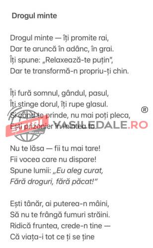De această dată, vocile care au transmis mesajul nu au fost doar cele ale polițiștilor, ci și ale elevilor care au ales să lupte, prin creații artistice, împotriva tentațiilor și pericolelor ascunse în spatele substanțelor interzise.