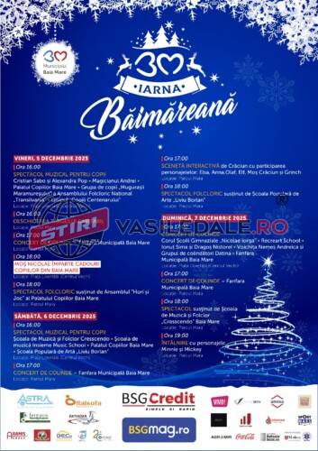 Iarna Băimăreană continuă în acest final de săptămână cu momente pline de emoție, colinde, magie și bucurie pentru întreaga comunitate! 5–7 decembrie 2025 va aduce în Baia Mare spectacole pentru copii, întâlniri cu personaje îndrăgite, tradiții, folclor autentic și colinde care vor umple orașul de lumină și căldură.