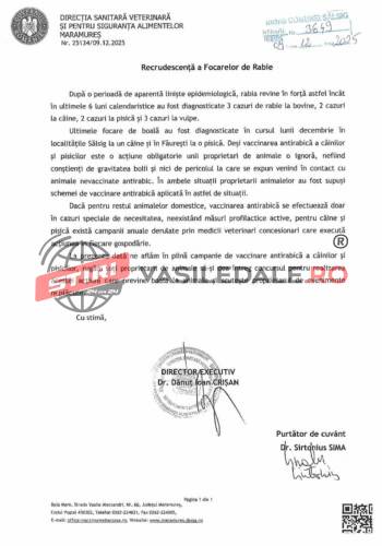În Maramureș au fost confirmate cazuri de rabie, inclusiv în animale depistate recent, conform comunicatului emis de A.N.S.V.S.A. Maramureș.