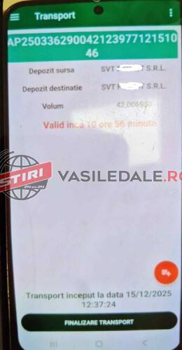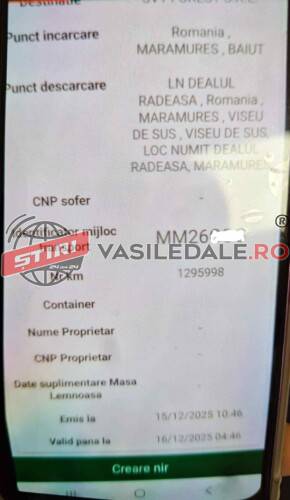 În data de 15.12.2025, la ora 10:46, am emis un aviz de însoțire a materialului lemnos, valabil până în data de 16.12.2025, ora 04:46, cu seria aviz AP25033629004212397712151046. După emiterea avizului, în momentul încărcării și atașării fotografiilor în aplicație, aceasta s-a deschis cu capturile de ecran atașate, în care apar următoarele date: Punct de încărcare: Maramureș – Băiuț Punct de descărcare: Vișeu de Sus, județul Maramureș Identificator mijloc de transport: MM 26 …. Număr kilometri: 1.295.998 Ora: 17:30 Depozit sursă: SVT …. S.R.L. Depozit destinație: SVT …. S.R.L. Cantitate: 42,006850 mc