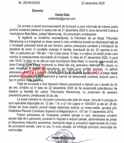 Ca urmare a cererii dumneavoastră de furnizare a unor informații de interes public privind incidentul petrecut în seara zilei de 21 decembrie 2025 în zona denumită Craica a municipiului Baia Mare, judeul Maramureș, vă comunicăm următoarele:
