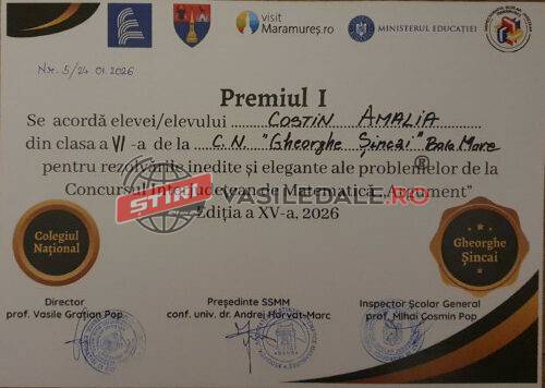 În urma participării la Concursul Interjudețean de Matematică „Argument”, ediția a XV‑a, Costin Amalia Luiza, elevă în clasa a VI‑a la Colegiul Național „Gheorghe Șincai” Baia Mare, a obținut Premiul I cu punctaj maxim. Este un rezultat la care a muncit mult. Ea ne-a trimis o scrisoare de apreciere pe care o redăm mai jos: