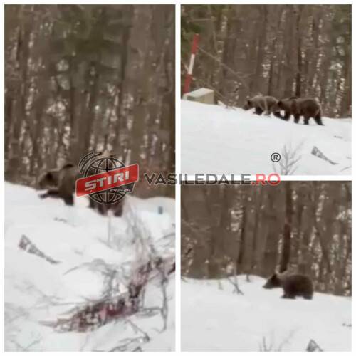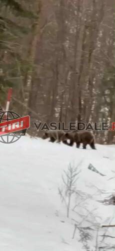 Turiștii au pus imediat mâna pe telefoane și au filmat o ursoaică și doi pui care treceau în imediata apropiere cabanei.