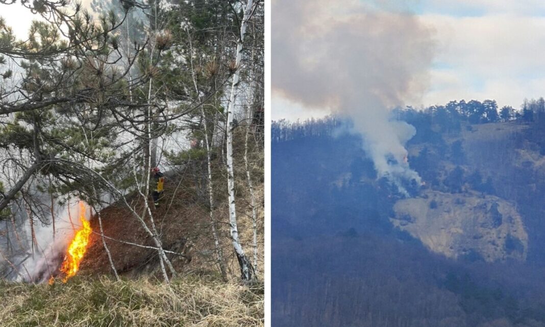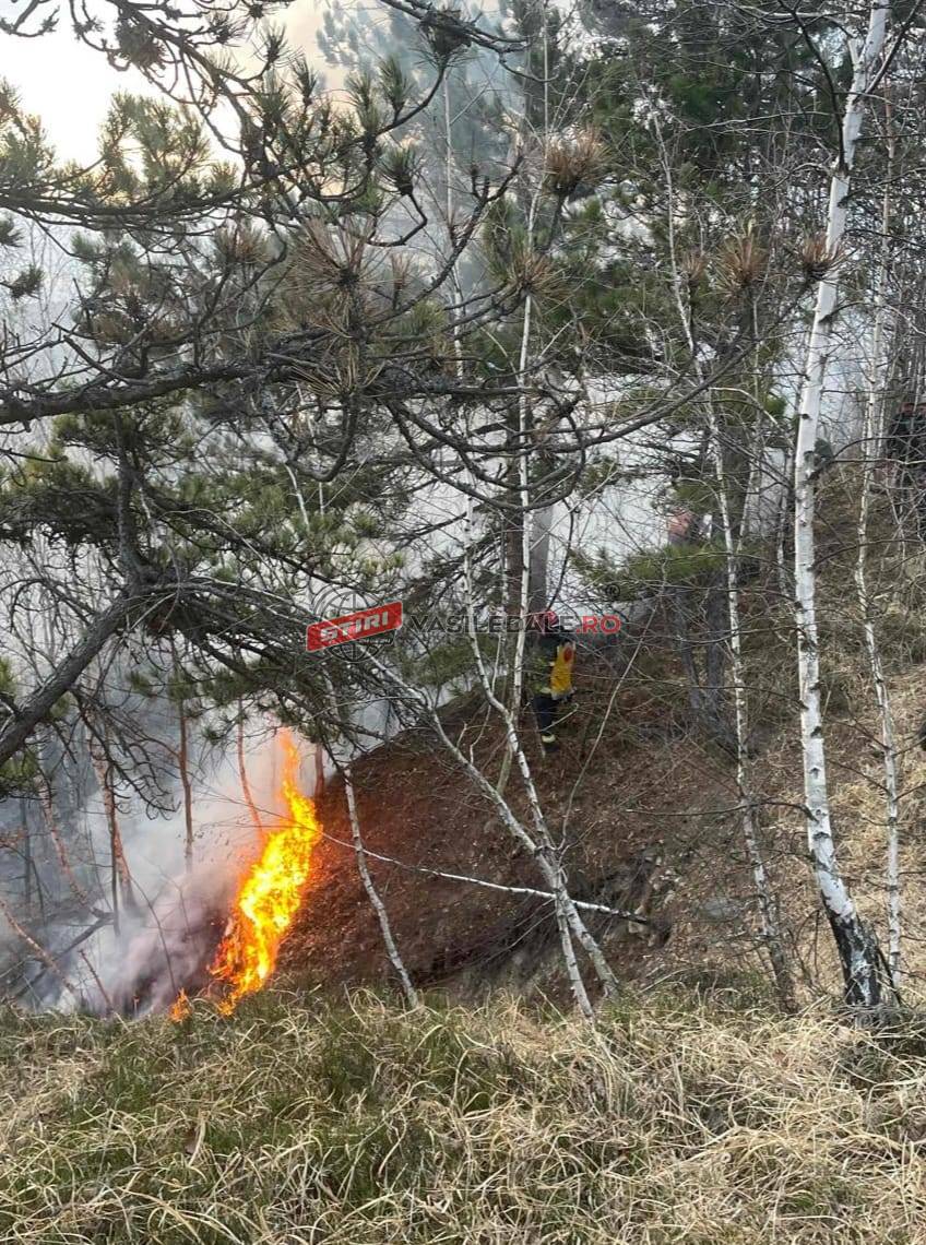 La fața locului acționează și pompierii voluntari din localitate, alături de lucrători ai Ocolului Silvic.