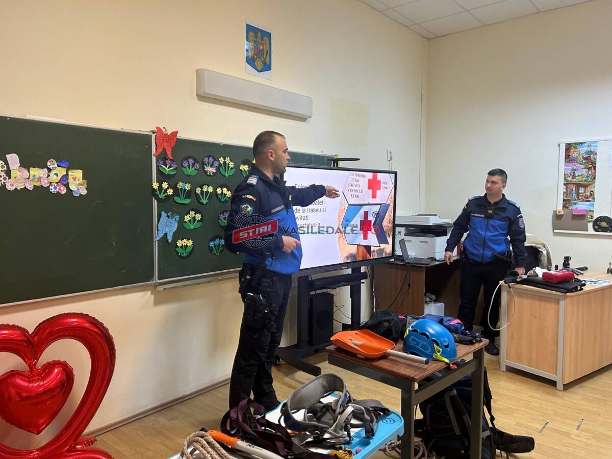 Mai întâi, jandarmii le-au prezentat într-un mod atractiv ce presupune pregătirea pentru o ieșire la munte: cum alegem un traseu montan, care sunt elementele de echipament necesare în drumeție sau în ce moment planificăm o ieșire în natură. Fișele de lucru pregătite special pentru ei de jandarmi nu i-au pus în dificultate și nici întrebările despre animalele sălbatice. Distracția a fost garantată când jocul a presupus imitarea unui animal sau redarea sunetului după care acesta este recunoscut.