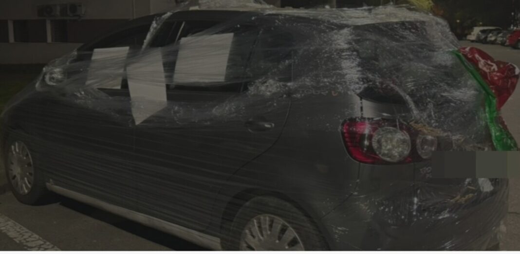 În seara de joi, un autoturism a fost împachetat, la propriu, în folie alimentară, pe strada Școlii din Baia Mare. Cel mai probabil este vorba despre o farsă făcută între prieteni sau colegi, însă aceasta poate avea urmări.