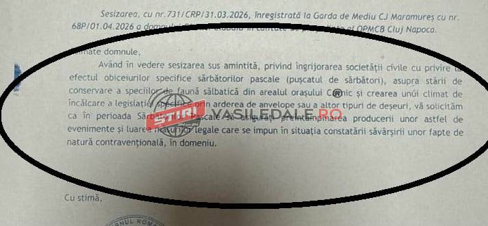 ”Vă informăm că, în urma unei sesizări oficiale înregistrate la Garda Națională de Mediu-Comisariatul Județean Maramureș, privind modul de desfășurare a unor obiceiuri specifice sărbătorilor pascale, au fost semnalate posibile efecte negative asupra mediului, în special prin arderea deșeurilor (ex. anvelope) și impactul asupra faunei din zona orașului Cavnic.