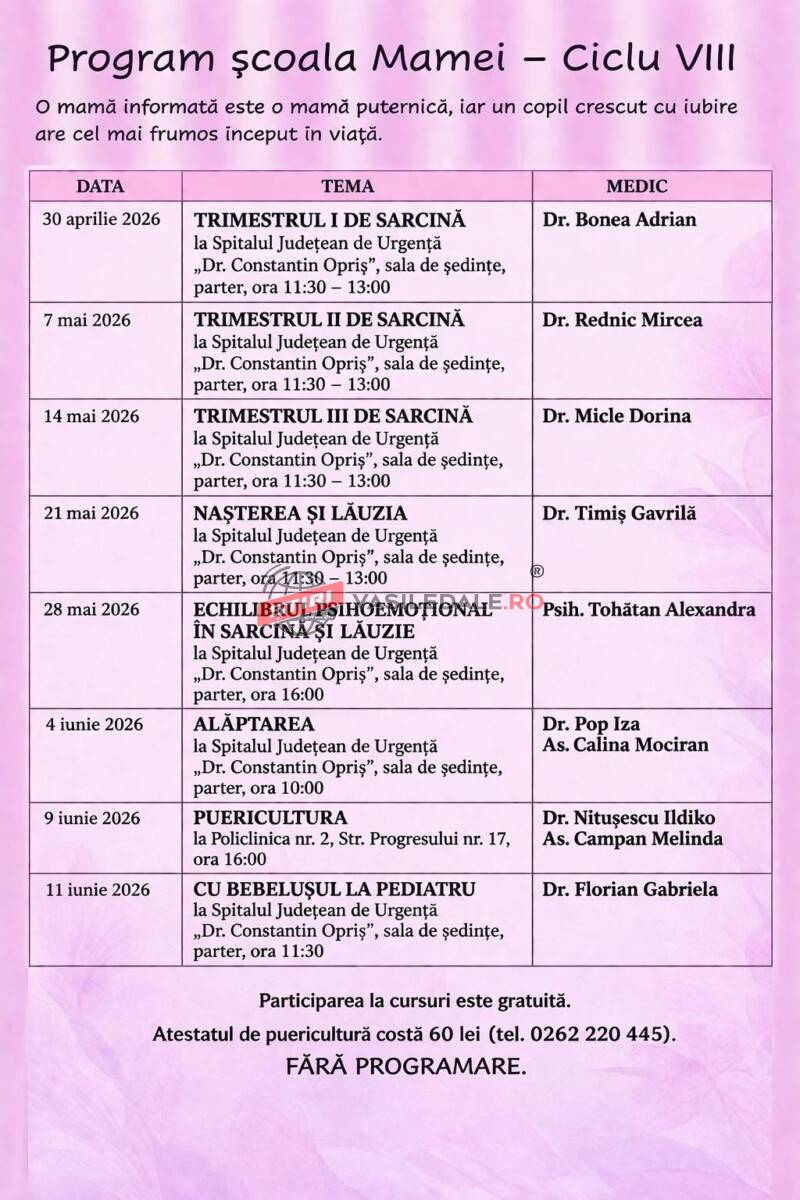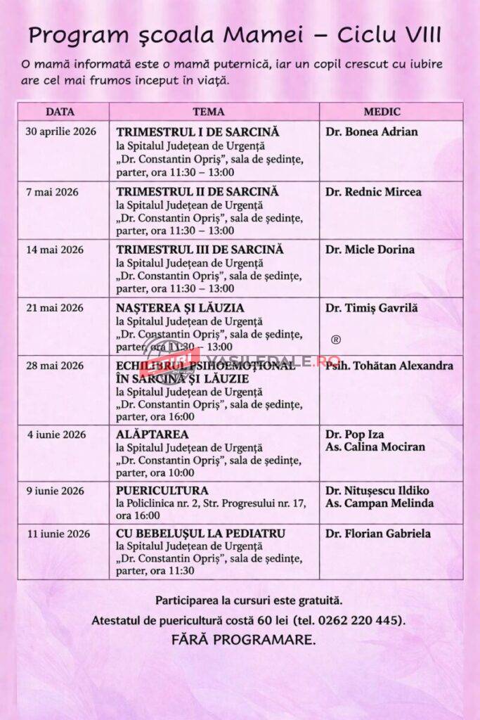 În cadrul „Școlii Mamei”, mămicile vor primi îndrumare de la medici și specialiști despre fiecare etapă a sarcinii, naștere, alăptare și îngrijirea bebelușului, dar și despre echilibrul emoțional atât de important pentru ele și pentru copil. Școala se va desfășura în perioada 30 aprilie – 11 iunie 2026 la Spitalul Județean de Urgență „Dr. Constantin Opriș” și Policlinica nr. 2 pentru un modul). Participarea este gratuită, nu este necesară programare. Fiecare început de viață merită grijă, încredere și sprijin încă din primele momente.