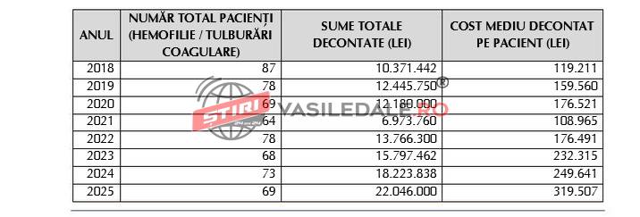 Analiza are la bază datele centralizate de Casa de Asigurări de Sănătate Maramureș pentru perioada 2018-2025 și urmărește evoluția sprijinului acordat pacienților cu hemofilie și alte tulburări importante de coagulare, inclusiv hemofilia A și B, boala von Willebrand, deficitul congenital de factor VII și formele simptomatice dobândite. Ceea ce arată aceste date este un fapt limpede: nu numărul pacienților a crescut semnificativ, ci nivelul de finanțare alocat fiecărei persoane aflate în tratament. După anii 2020 și 2021, marcați de efectele pandemiei asupra adresabilității, numărul cazurilor tratate a revenit în 2022. În schimb, fondurile necesare au continuat să crească de la un an la altul, pentru că tratamentul hemofiliei s-a schimbat profund. Tot mai mulți pacienți beneficiază de terapii administrate preventiv, menite să evite sângerările severe, complicațiile și pierderea mobilității, iar în paralel au fost introduse tratamente noi, performante, dar costisitoare. Pentru unele dintre aceste terapii, costul mediu a ajuns la 686.736 lei pe pacient în 2024 și la 711.816 lei în 2025. În cazurile cele mai complexe, inclusiv la copii cu inhibitori cu titru mare, costul anual al tratamentului a depășit 900.000 lei.