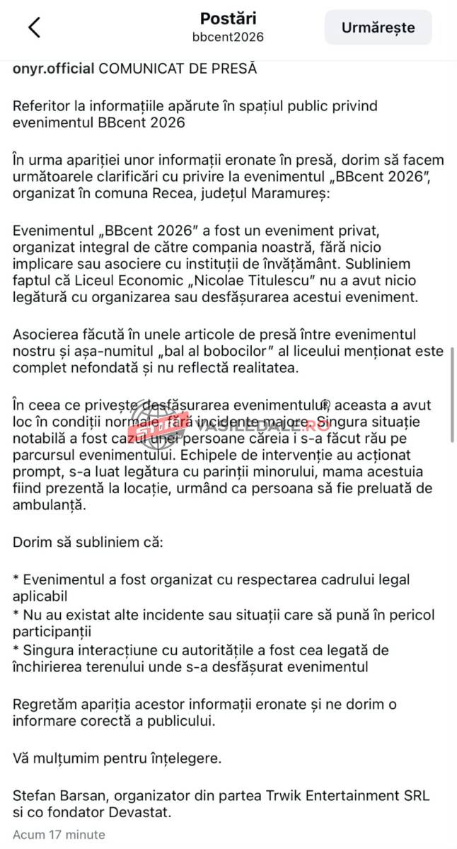 ”În urma apariției unor informații eronate în presă, dorim să facem următoarele clarificări cu privire la evenimentul „BBcent 2026”, organizat în comuna Recea, județul Maramureș: Evenimentul „BBcent 2026” a fost un eveniment privat, organizat integral de către compania noastră, fără nicio implicare sau asociere cu instituții de învățământ. Subliniem faptul că Liceul Economic „Nicolae Titulescu” nu a avut nicio legătură cu organizarea sau desfășurarea acestui eveniment.
